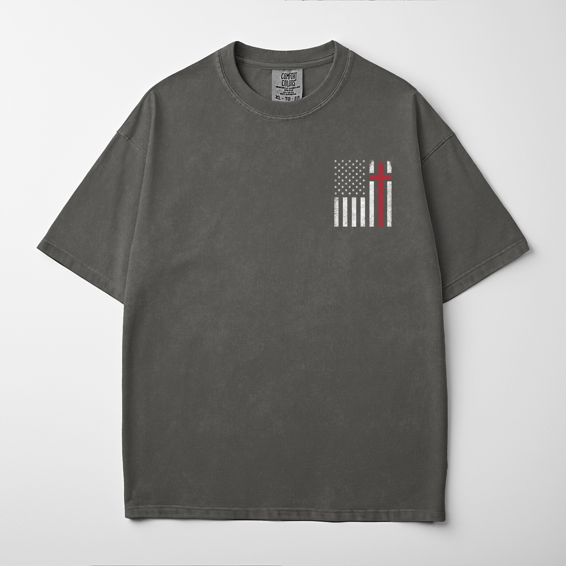 Bold. Patriotic. Unshakable. This “Faith Over Fear” design turns the American flag into a cross, reminding us that courage comes not from ourselves but from Christ. With a distressed, rugged finish, it’s the perfect tee for those who stand strong in faith and country.