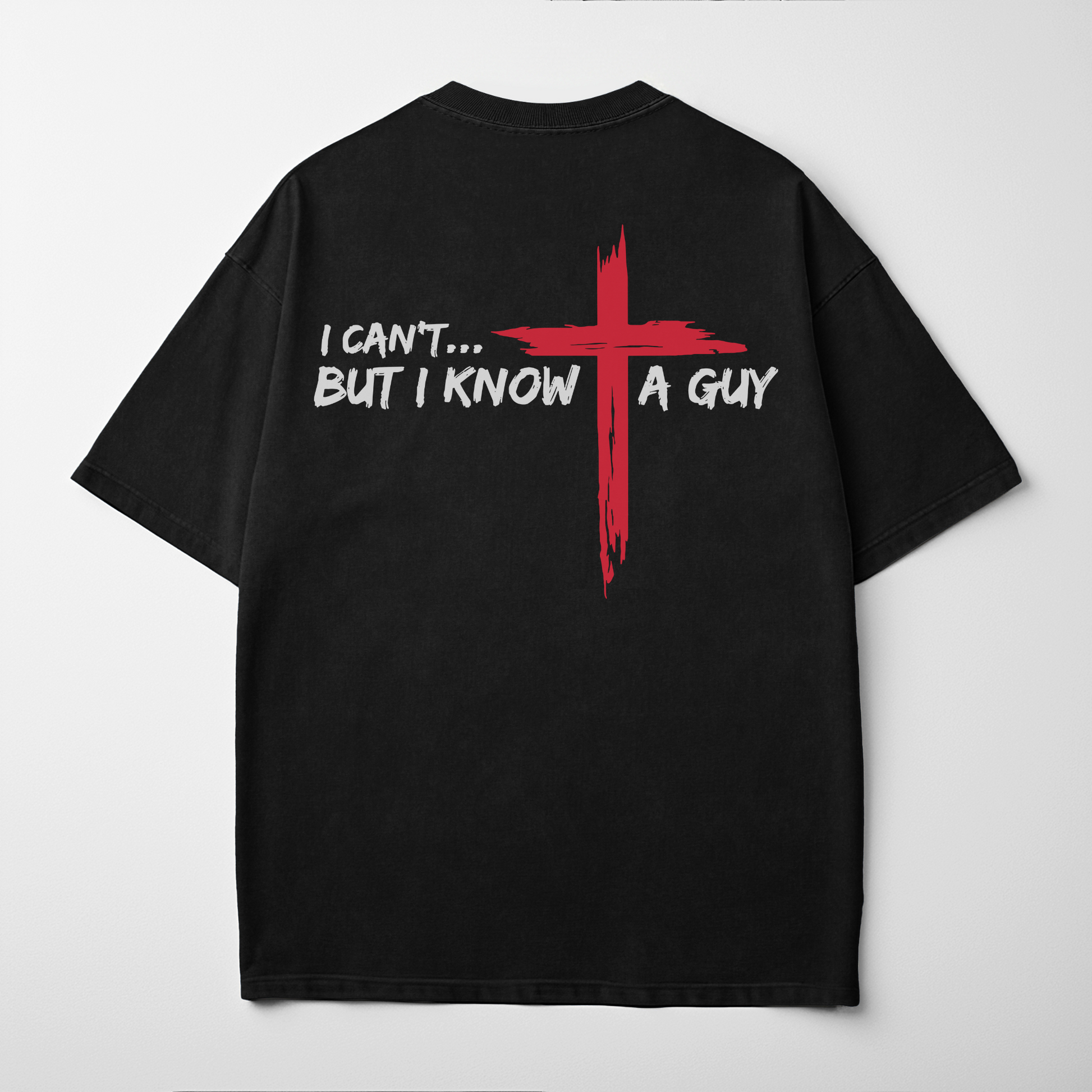 “I Can’t… But I Know a Guy” is a bold reminder that when our strength runs out, Christ is enough. The red cross stands as the centerpiece of faith, declaring that Jesus carries what we cannot.