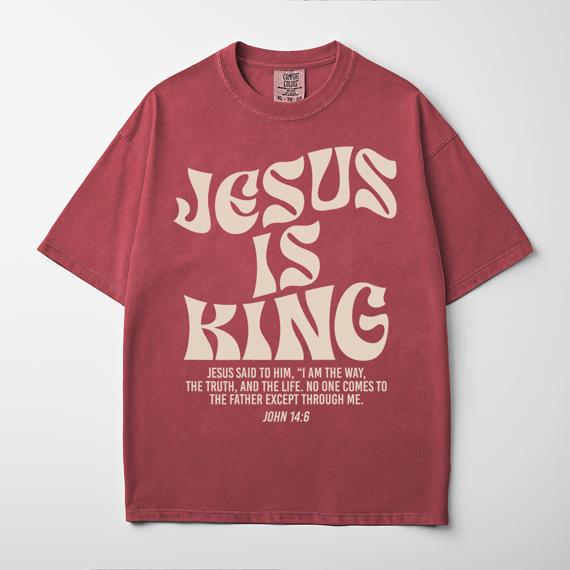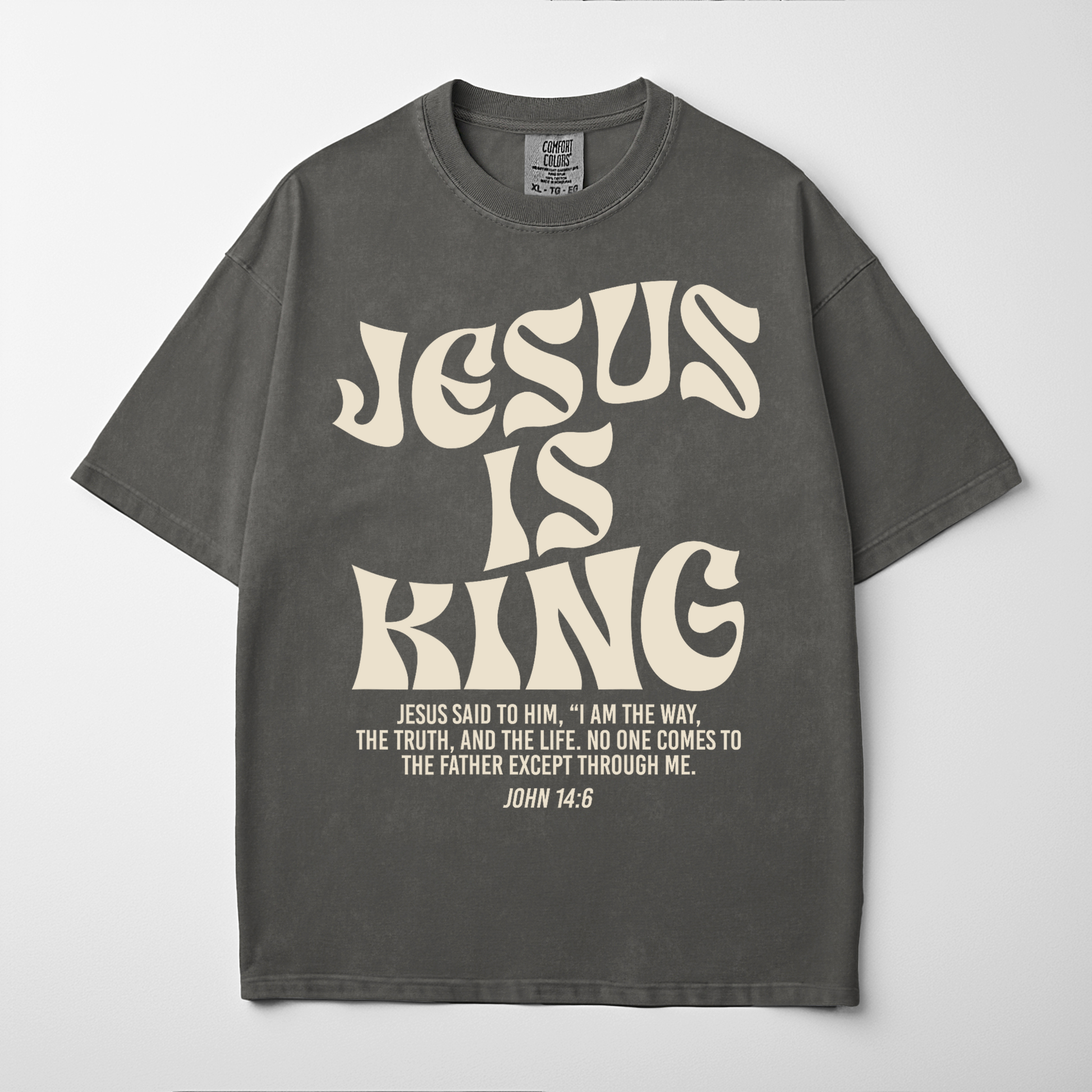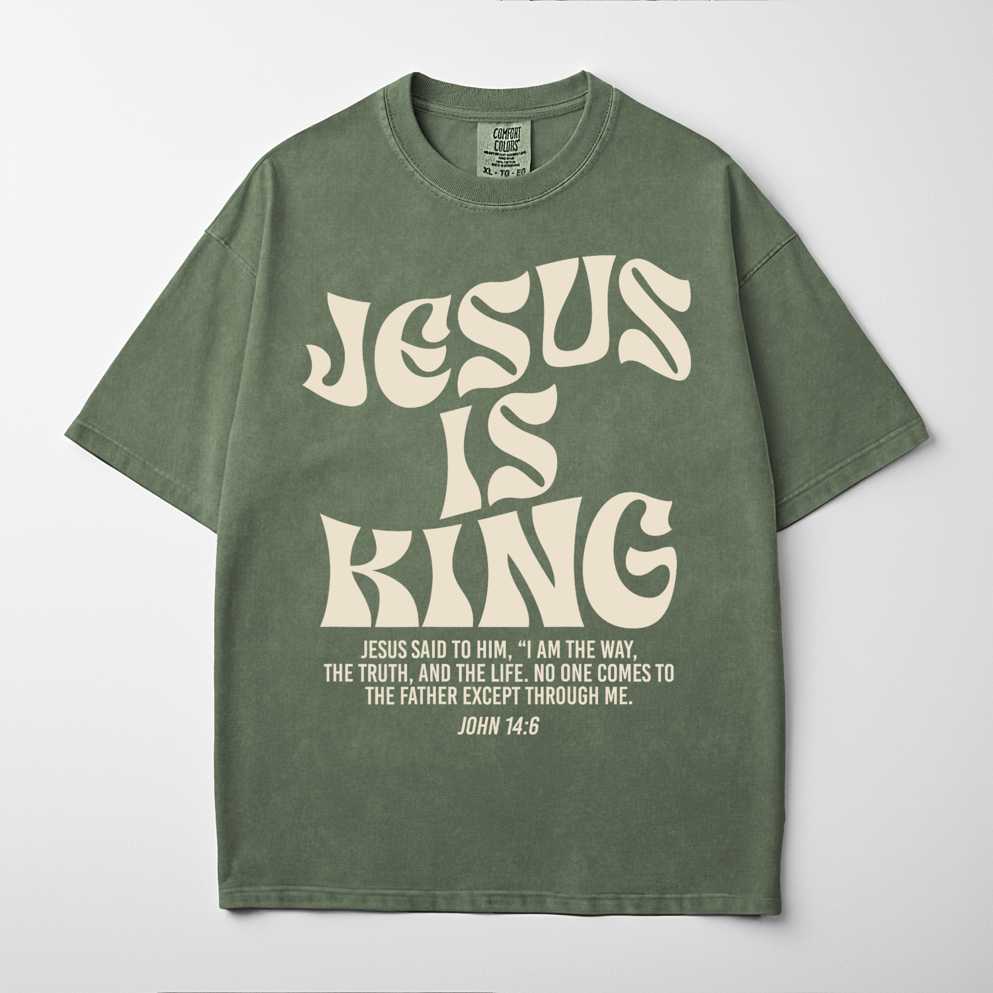 “Jesus Is King” draws from John 14:6: I am the way, the truth, and the life. No one comes to the Father except through Me. The bold, wavy typography turns the declaration into a visual anthem — unmistakable, unashamed, and timeless.
