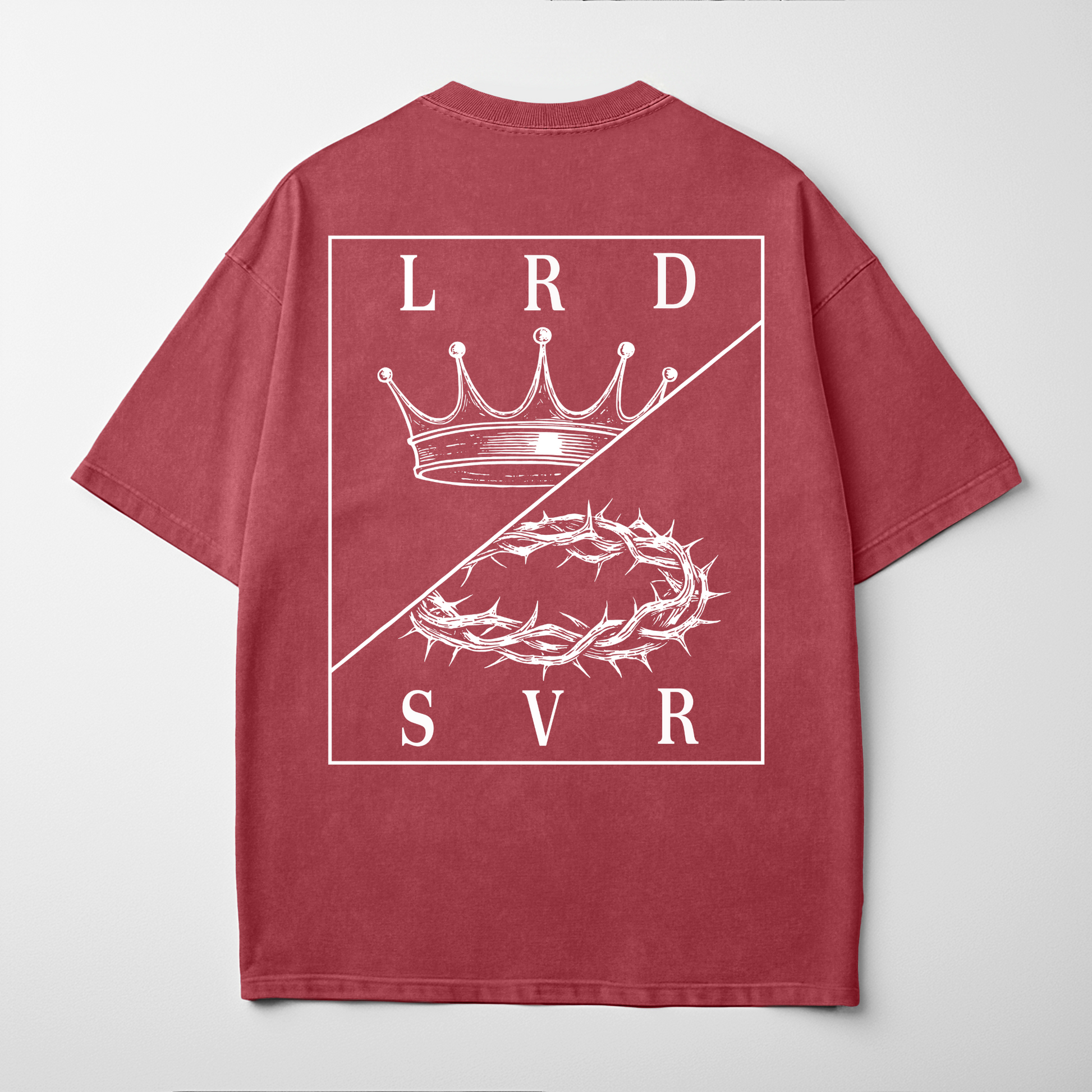 “Lord & Savior” unites the crown and the cross—Jesus as King and Redeemer. The chest print keeps it subtle on the front, while the back graphic boldly declares His sacrifice and victory with a striking crown-and-thorns design.