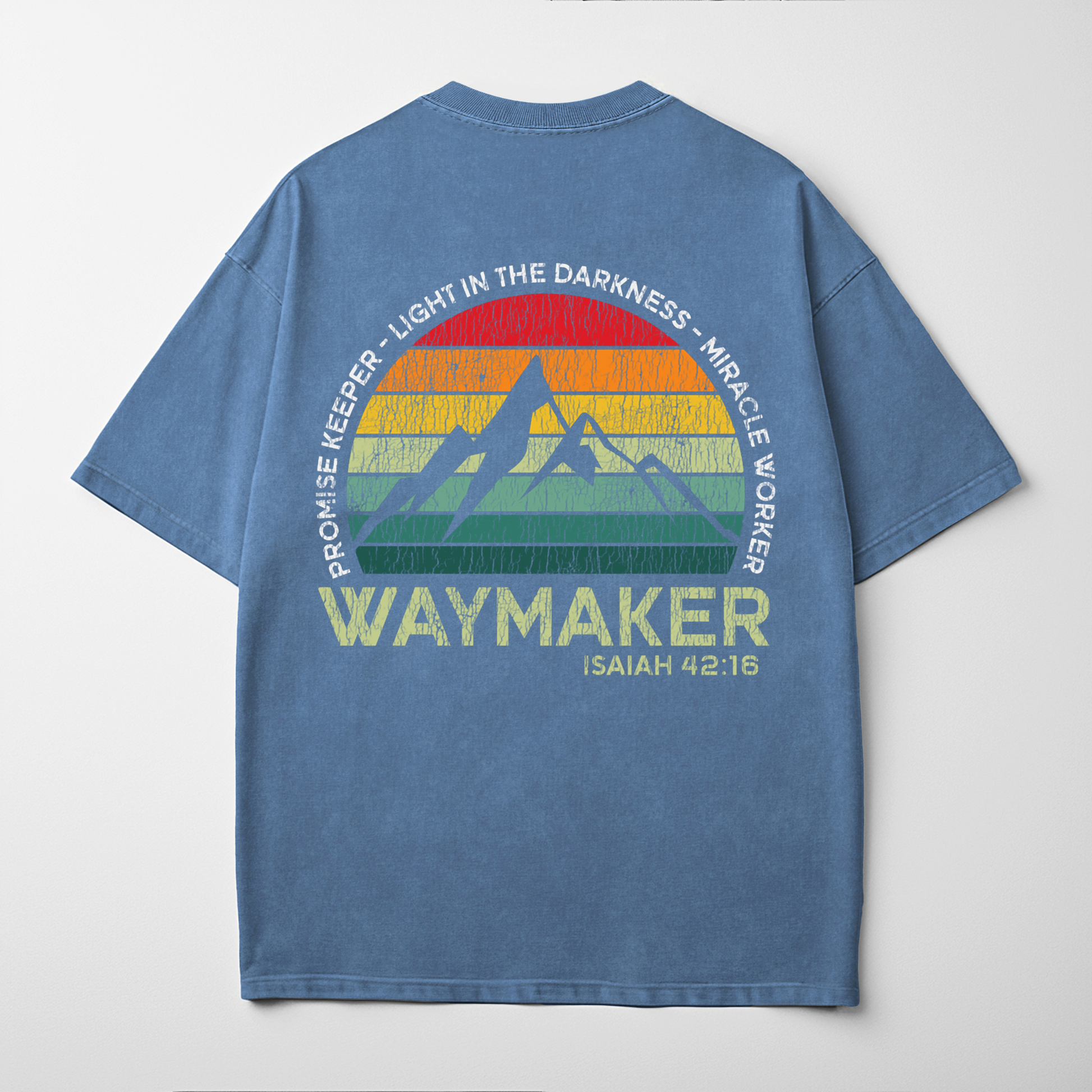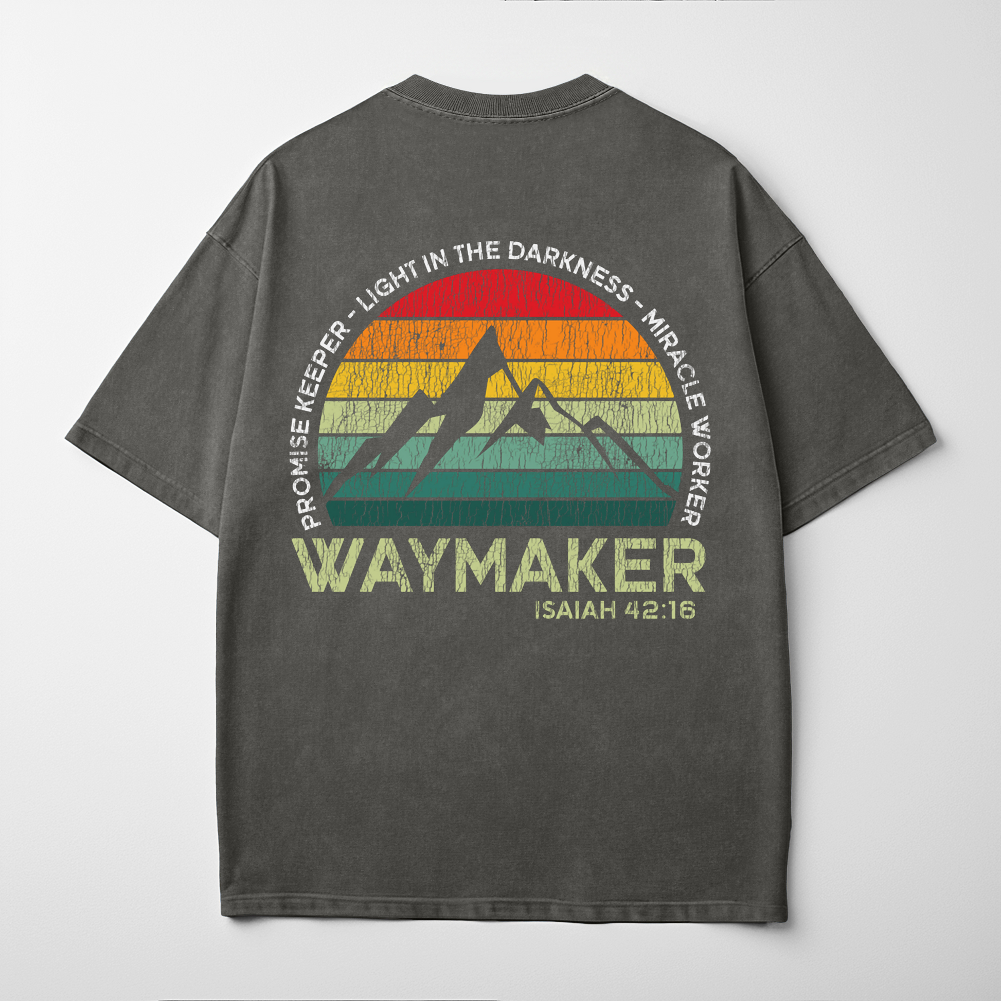 “Waymaker” draws from Isaiah 42:16—God guiding His people through the unknown. The bold mountain-and-sunset design declares Him as Promise Keeper, Light in the Darkness, and Miracle Worker. Clean front print, commanding back graphic for unashamed faith.